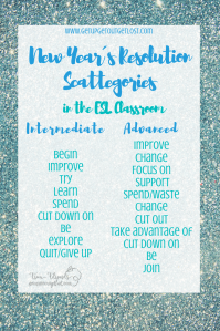 Scattegories is always a great warm-up to get the juices flowing! In this version of the game, I provide action verbs that are commonly used for resolutions and in pairs my students have to brainstorm likely New Year´s Resolutions. Once they have a solid list, we use these phrases and structures to build our home goals for the coming year. #ESLLessonPlans #ESL #eFL #TeachingEnglishAbroad #TeachingEnglishinSpain #SpainLanguageAssistants #CELTA #ESLNewYear #ESLNewYearsResolution