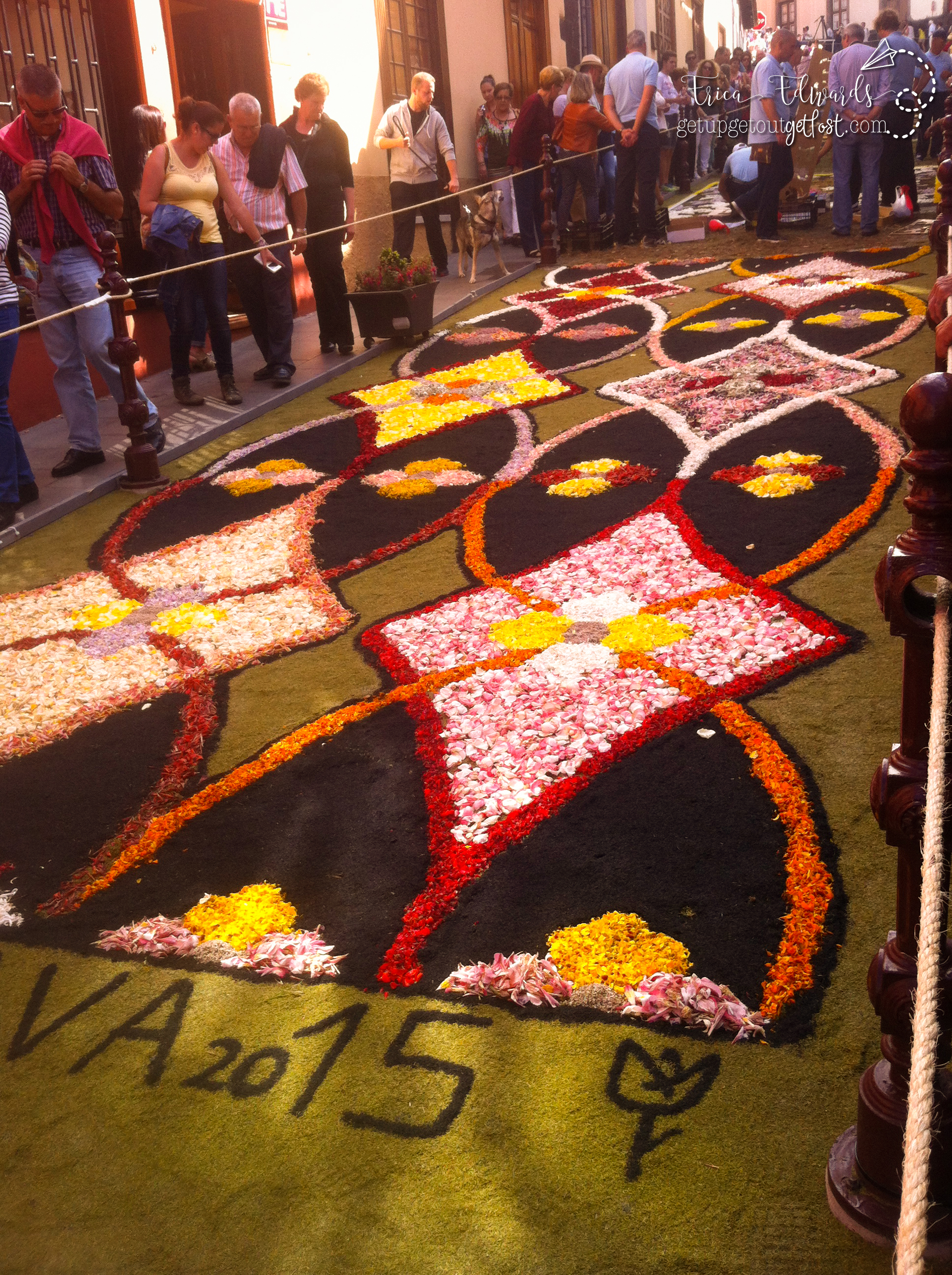 The Catholic Feast of Corpus Christi takes place every year 60 days after Easter and is celebrated with floral carpets in many parts of Spain, like here in La Orotava, Tenerife (Canary Islands). In La Orotava, the tradition includes a giant display at the Plaza del Ayuntamiento in front of the town hall. #laorotava #alfombrasdeorotava #tenerife #canaryislands #corpuschristi