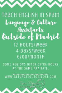 Due to a lower cost of living, Language Assistants outside of Madrid work less hours and earn a bit less – €700/month for 12 hours/week classroom hours. #teachinspain #teachenglishinspain #teachenglishabroad #teachingenglishabroad #languageassistants #northamericanlanguageassistants #languageandculturalassistants #movetospain #teachenglishabroad #tesl #tefol #celta #esl